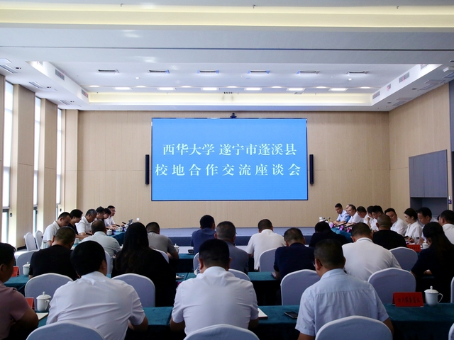 考察调研后,西华大学-遂宁市蓬溪县校地合作交流座谈会在蓬溪县市民文化中心举行。蓬溪县委书记黄亚军在致辞中谈到,蓬溪正在加快建设“4+1”现代产业体系,希望学校从产业规划、项目编制等方面给予指导,带动校地间科技合作、技术服务与成果转化。蓬溪还将大力推进产教融合及校地合作、打造全新的职教中心,希望通过与西华大学的深入交流提升职教办学水平,诚邀学校专家常来蓬溪调研指导、师生多来蓬溪开展实践,不断深化拓展校地合作的领域,打造高校结队革命老区、助推乡村振兴的典范,开启校地合作新篇章。