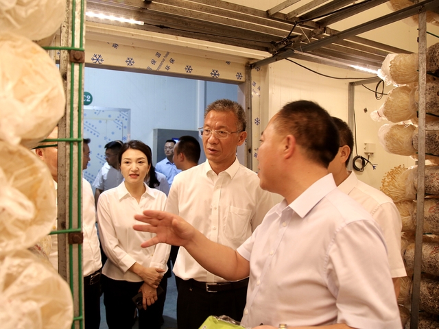刘树根一行首先抵达蓬溪县大石镇牛角沟村,考察调研“中国红军第一村”建设情况。随后,刘树根一行来到蓬溪县食用菌现代农业园区,先后走访了现代农业示范区食用菌孵化交易中心、四川琪英菌业股份有限公司、蓬溪骆峰菌业有限公司等园区企业,实地调研杏鲍菇、虫草花、鹿茸菇、黄色金针菇等食用菌工厂化生产现状,深入了解食用菌产业发展情况。