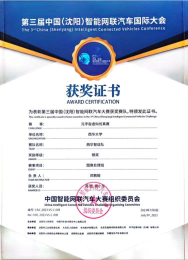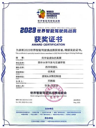 西华明德队在天津的“2023世界智能驾驶挑战赛(WIDC)”中的获奖证书