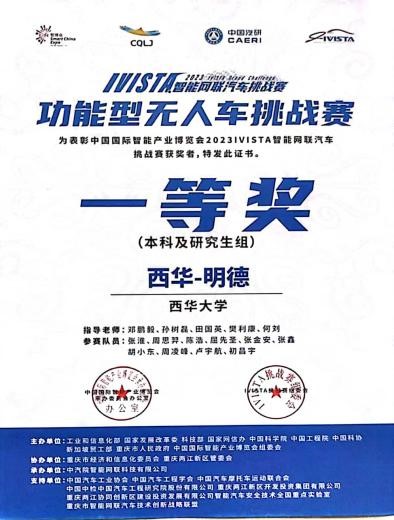 8月14日至20日,由工业和信息化部、国家发展和改革委员会、科学技术部、国家互联网信息办公室、中国科学院、中国工程院等部委联合主办的“2023 i-VISTA智能网联汽车挑战赛”在重庆两江新区举行,西华大学“西华明德”智能车队斩获“功能型无人小车挑战赛”一等奖。