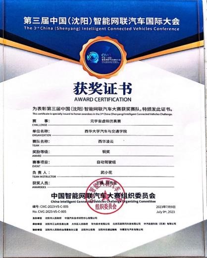 “西华明德”智能车队由西华大学汽车与交通学院新能源与智能汽车团队研究生组建,主要成员包括张准、周思弈、陈浩、屈先圣、张金安、张鑫和胡小东等,指导教师为邓鹏毅、孙树磊和田国英等。今年以来,团队研究生在全国性高水平自动驾驶技术比赛中屡获佳绩。5月,“西华卓越队”(陈云鑫、张鑫)、“西华明德队”(张准、张金安)在天津的“2023世界智能驾驶挑战赛(WIDC)-元宇宙虚拟仿真赛”中,获得优秀奖(第四、五名)。7月,“西华智信队”(陈浩、胡小东)、“西华凌云队”(王晨、屈先圣)在沈阳的“第三届中国(沈阳)智能网联汽车国际大会-元宇宙虚拟仿真赛”中分获银奖(第二名)、铜奖(第四名)。