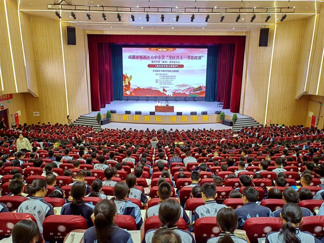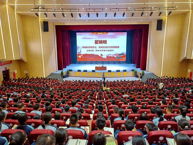 9月11日,由中共成都市郫都区委宣传部、中共成都市郫都区委统战部、西南交通大学主办,西华大学和成都工业学院协办的郫都区大中小学生“全区共上一节思政课”暨科学家精神进校园活动在郫都一中大礼堂举行。我校50名师生现场聆听了我国铁路工程动力学专家、中国科学院院士、西南交通大学首席教授翟婉明作的题为《我的求学与交通梦》的思政课。