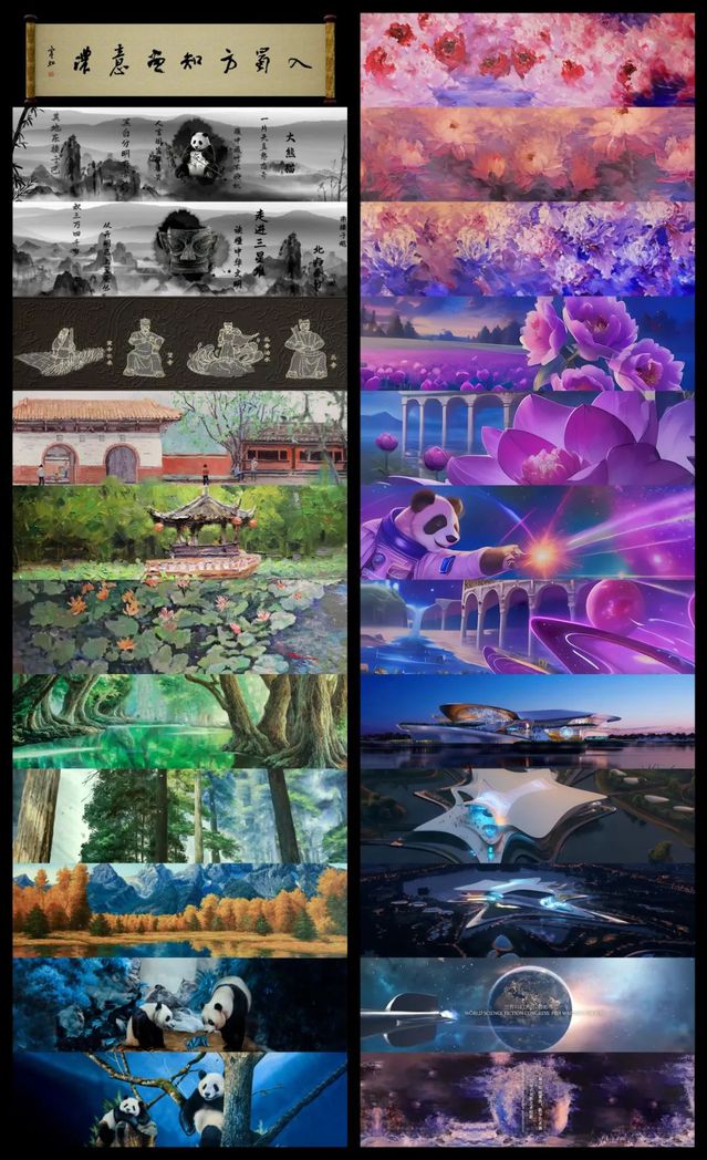 西华大学美术与设计学院艺术与科技师生团队在传统艺术画展基础上,结合现代数字技术打造了沉浸式光影艺术厅。创作团队主要采集了白云峰的《子规花落水,睡莲花开》,李本贵的《千年望丛之二》《千年望丛之三》《千年望丛之四》,肖利禄的《望丛祠》,万山河的《四季》《熊猫》《幻》。通过高清数据采集了画面信息,并运用特效手段以数字化形式活化名家画作,让传统艺术插上现代数字化的翅膀。