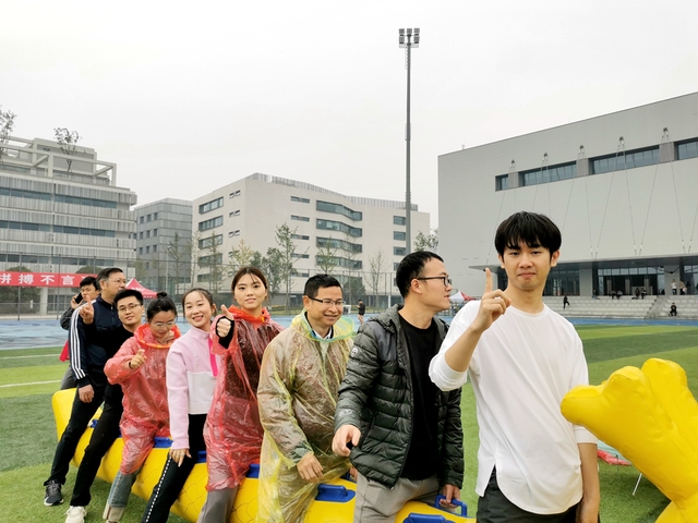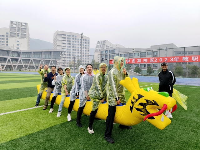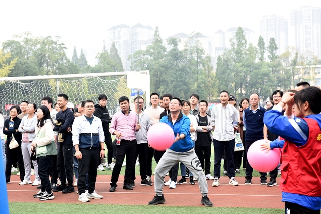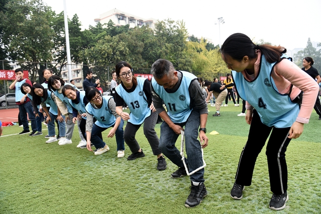 本次趣味运动会延续了金龙钻圈等老师们喜闻乐见的传统项目,并在正式比赛前增加了一项别开生面的热身操项目,这也成为本次运动会的一大亮点。在郫都校区,伴随动感十足的音乐声和充满激情的口令声,体育学院健美操专业教师易刚及其学生带领600余名教职工在郫都校区锦地苑运动场跳起热身操,从舒缓的拉伸到充满律动感的击掌、踏步和跳跃,短短几分钟内,老师们充分体会到健美操的魅力,深感意犹未尽。在宜宾校区,体育学院葛和平老师带领100余名教师在舒缓优美的音乐中练起了八段锦,一舒一展、一招一式之间尽显中华传统体育之美。