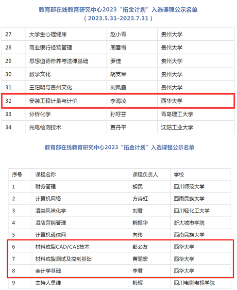 近日,教育部在线教育研究中心公布了2023年“拓金计划”入选课程名单。本年度“拓金计划”共遴选出63门课程,其中我校李海凌老师的《安装工程计量与计价》、彭必友老师的《材料成型CAD/CAE技术》、黄丽宏老师的《材料成型测试及控制基础》和李君老师的《会计学基础》成功入选,实现我校课程建设新突破。