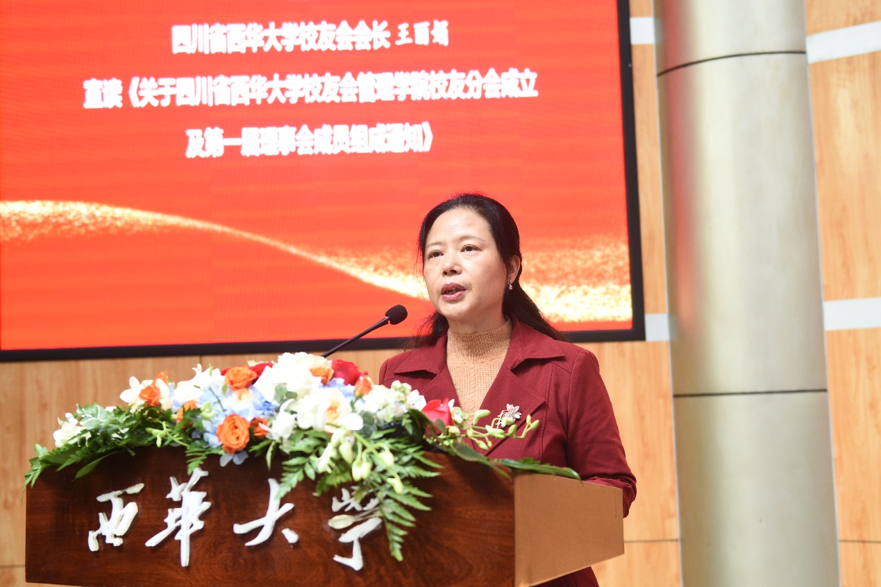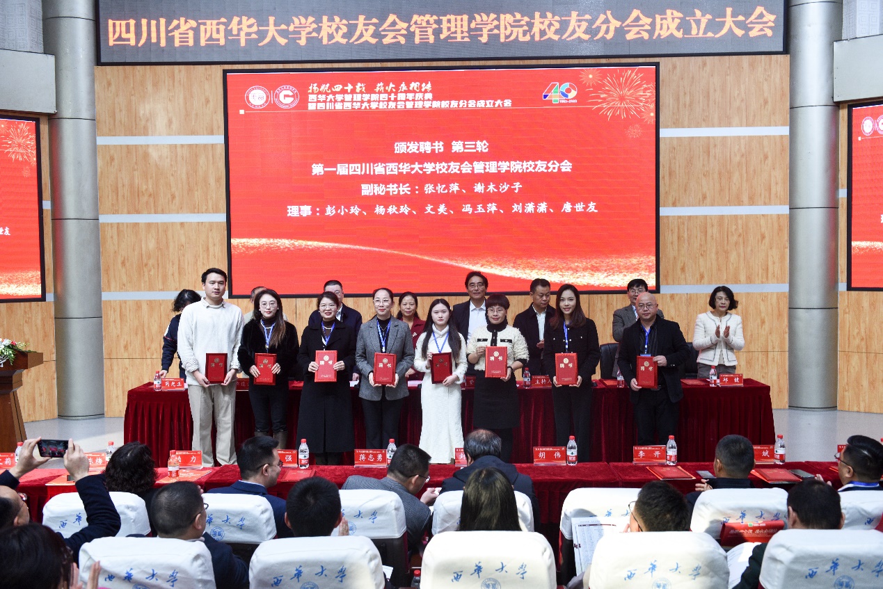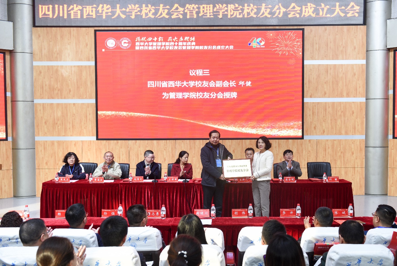 西华大学校友会会长王丽娟宣读《关于四川省西华大学校友会管理学院校友分会成立及第一届理事会成员组成通知》文件。西华大学校友会副会长邱健为管理学院校友分会授牌。随后,主席台领导、嘉宾为第一届理事会成员颁发了聘书。