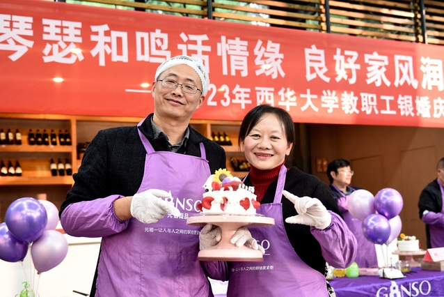 老师们还携手制作了象征爱情圆满、生活甜蜜的纪念蛋糕,秋日暖阳下,摄影机为银婚家庭定格美好瞬间,庆典活动在温柔暖阳中落下了帷幕。