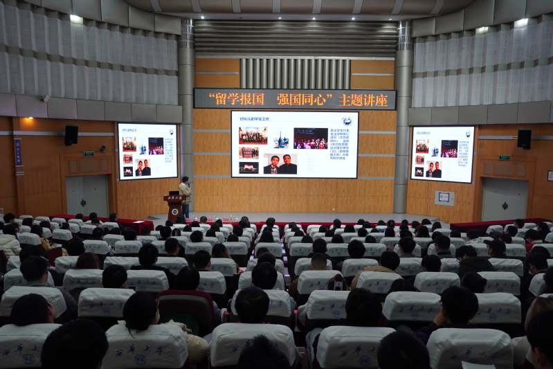为学习贯彻习近平总书记致欧美同学会成立110周年贺信精神,弘扬留学报国传统,投身强国复兴伟业,助力立德树人根本任务,12月1日,“留学报国,强国同心”主题讲座在四教报告厅举行。本次活动由四川省欧美同学会、致公党四川省直工委联合主办,西华大学党委统战部、四川省欧美同学会教科委、致公党西华大学支部、党委学生工作部、党委教师工作部承办。学校海外留学归国教师代表和各学院学生代表共计200余人参加。