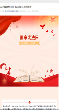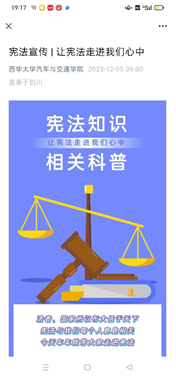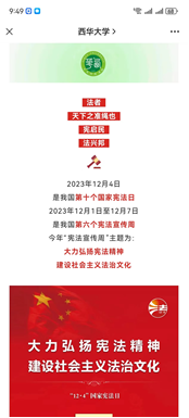 为深入学习贯彻党的二十大精神,认真贯彻落实习近平法治思想,根据教育部、教育厅等上级部门工作安排以及相关文件精神,西华大学高度重视,认真部署,引导师生积极参与以“大力弘扬宪法精神,建设社会主义法治文化”主题的宪法宣传周系列活动。