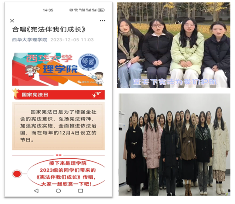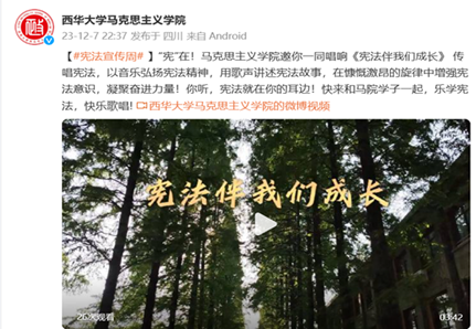 充分发挥宪法主题歌曲的育人作用,在歌曲中传唱宪法知识,彰显宪法精神。我校学生在全省学生《宪法伴我们成长》合唱比赛基础上,积极拍摄制作宪法教育宣传影音作品,通过教育部普法网、抖音、易班等各类新媒体渠道上传、展播优秀传唱作品。