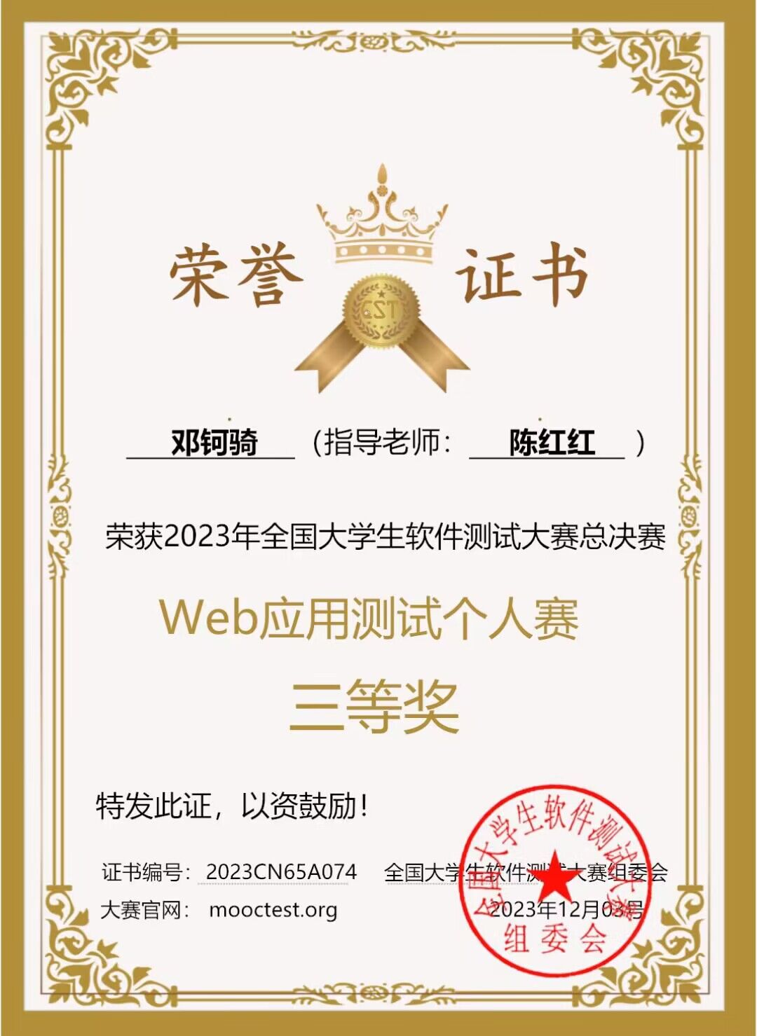 经过预赛、省赛的激烈竞争,我校计算机与软件工程学院的邓钶骑同学脱颖而出,进入全国总决赛,并荣获全国三等奖。计算机与软件工程学院的陈嘉辉同学获省赛二等奖,李贵娇、曹景、陆应芳三位同学获省赛三等奖,吴邓江等同学获省赛优胜奖。这是我校学子第一次参加全国大学生测试大赛。在指导老师的帮助下,他们通过努力为学校赢得了荣誉,充分体现了我校学子在软件测试领域的全面素质和卓越能力。