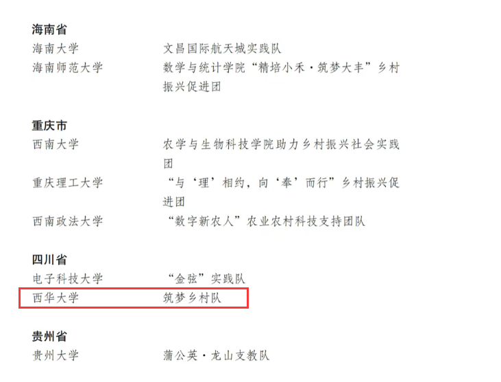 近日,共青团中央服务青年发展官方平台公布了2023年乡村振兴“笃行计划”专项行动优秀组织单位、优秀实践团队以及优秀实践个人表彰名单,98个“笃行计划”专项行动优秀组织单位、95个优秀实践团队、89名优秀实践个人受到表彰。我校建筑与土木工程学院“筑梦乡村队”获评优秀实践团队。