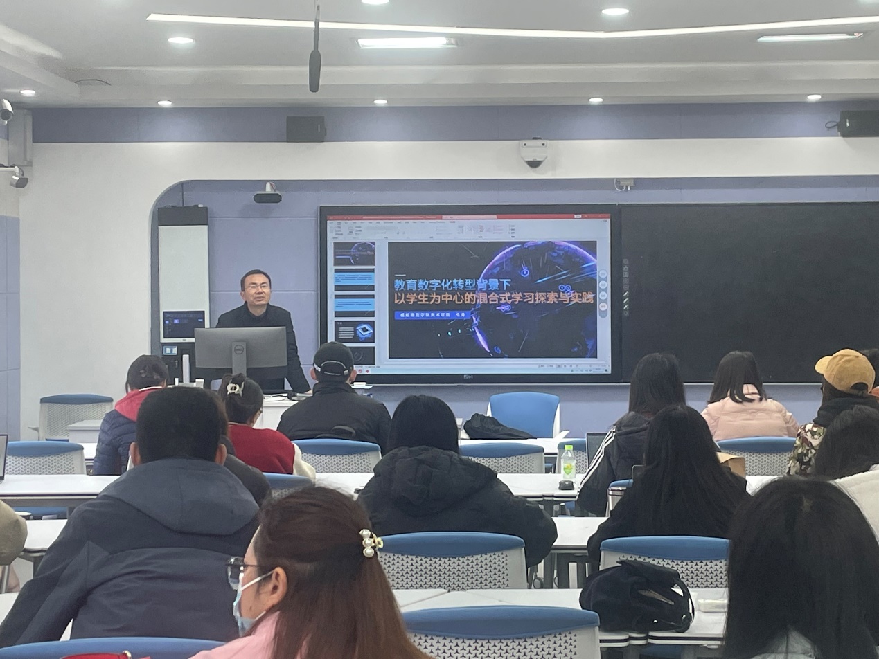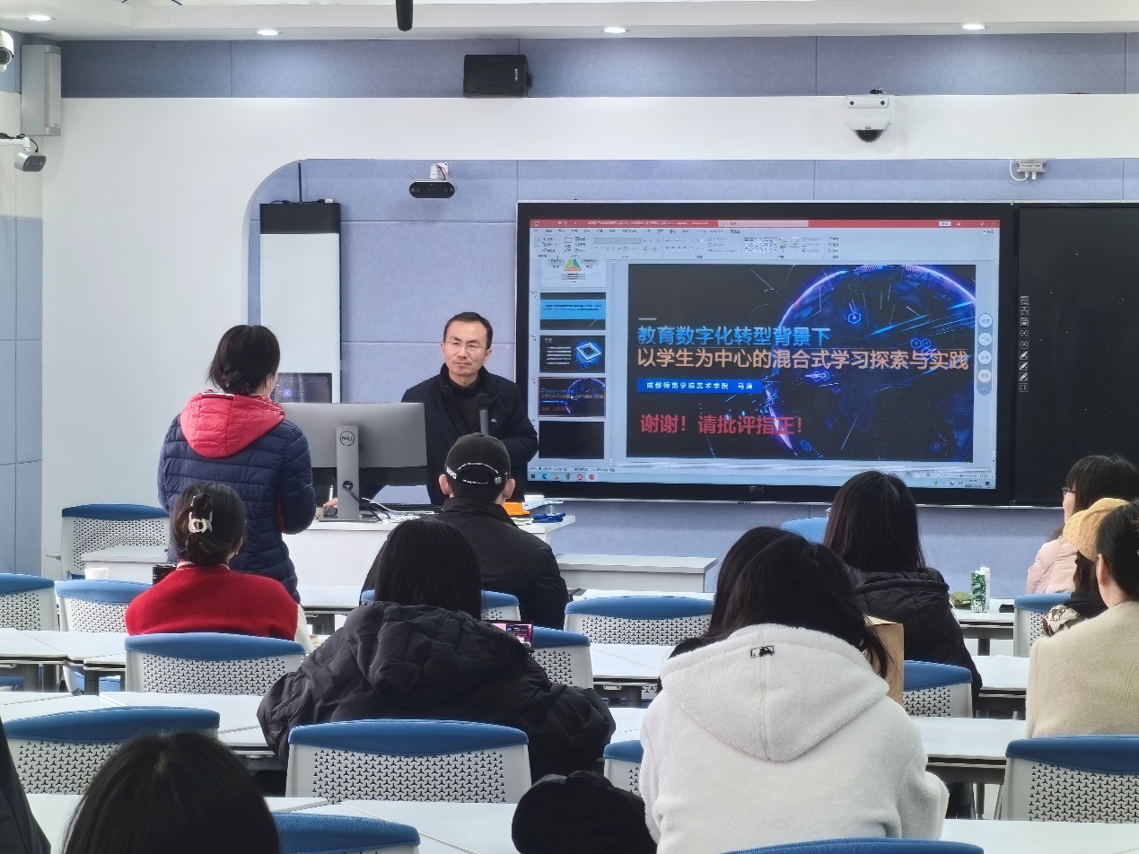 为落实立德树人根本任务,适应教育数字化转型需要,提升我校教师教育教学能力,促进教师理解混合式教学、混合式学习的核心特征,提高混合式教学目标达成度,学校启动了“混合式教学研修班”项目,首期研修班共42名学员报名参加。12月14日,研修班第一期工作坊开班,成都师范学院美术学院党委副书记马涛教授以“教育数字化转型背景下以学生为中心的混合式学习模式探索与实践”为主题进行专题辅导培训。此次培训由研修班学员及部分校内教师、校级督导团成员共50余人参加,教务处副处长刘雪梅主持。