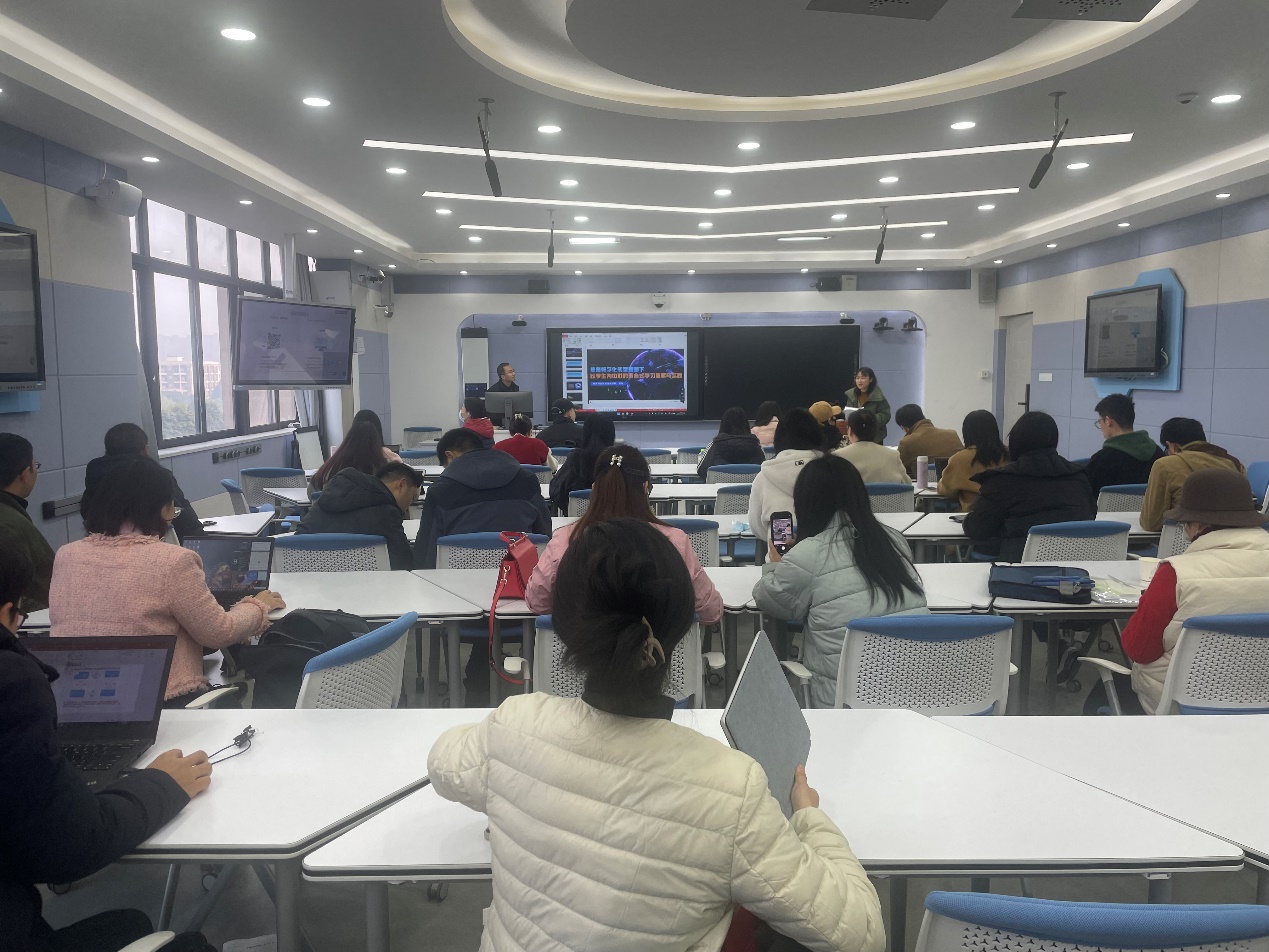 培训中,主讲人马涛教授聚焦教育数字化转型背景下,人工智能和大数据等新技术如何应用到混合式教学中,对未来教师应具备哪些核心竞争力、借助数字技术驱动教育教学转型、数字时代教师数字素养夯实策略、基于数据分析的混合式学习关键、借力数字技术实施混合式学习等五个方面进行了深入浅出的案例分析。最后,马涛教授对老师们提出的资源的版权问题、混合式教学线下讨论的运用等问题进行了回应与解答。参加培训的教师和教学督导专家们积极参与互动,教师反馈效果良好。