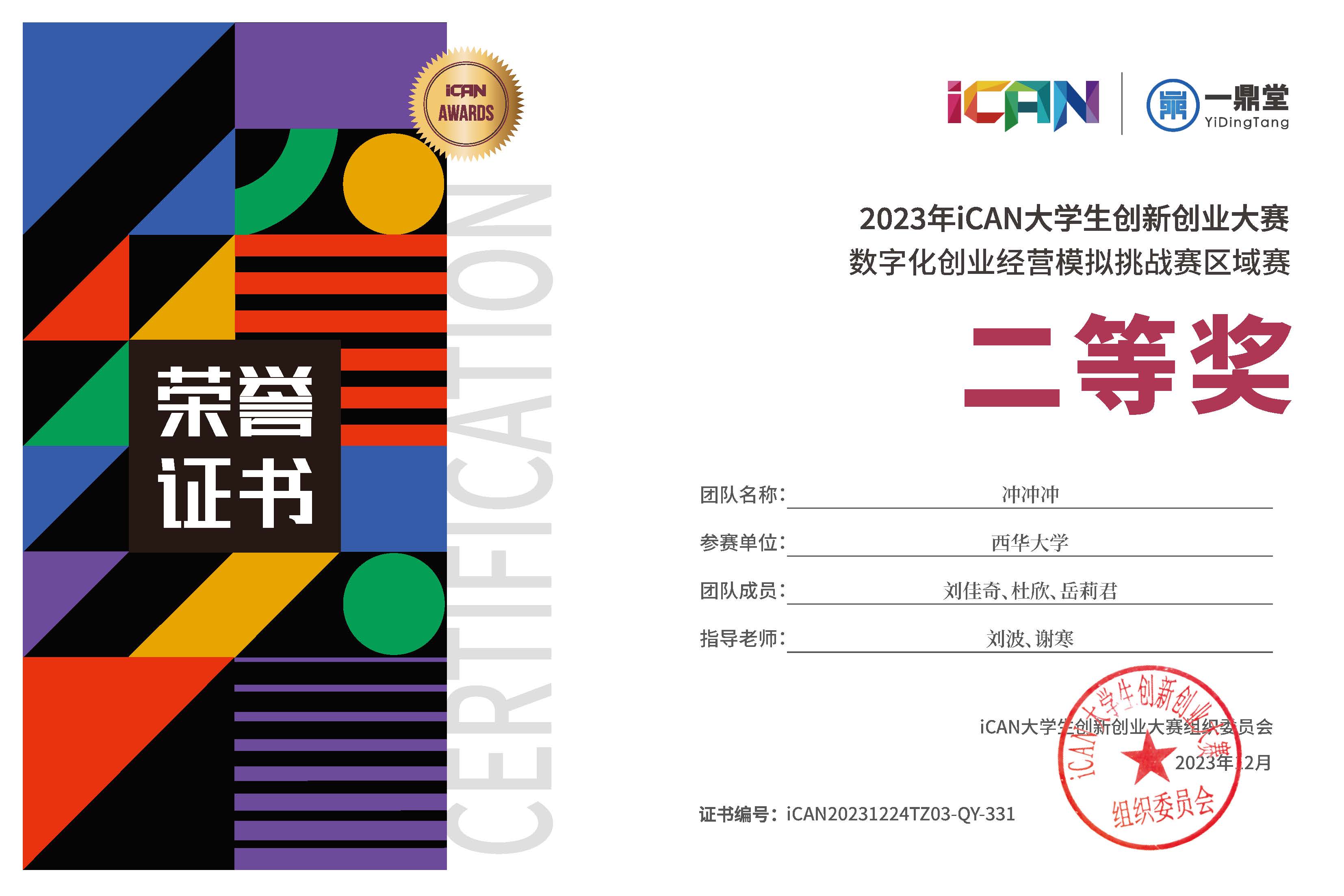 近日,由中国信息协会主办的iCAN大学生创新创业大赛数字化创业经营模拟挑战赛全国总决赛在江苏举办。由我校管理学院2022级财务管理专业刘佳奇、岳莉君和2022级物流管理专业杜欣组成的“冲冲冲”队,在指导老师刘波、谢寒的指导下,荣获全国二等奖。