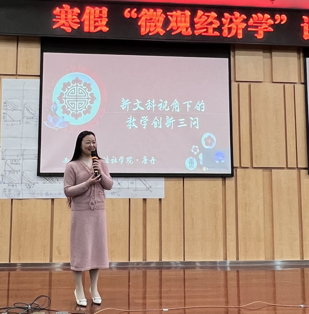 备课会的第三天进行了国家一流课程建设经验分享和国家教学创新大赛经验分享,全国高校教师教学创新大赛一等获得者、我校法学与社会学学院唐丹教授作了题为“新文科视角下的教学创新三问”的国家教学创新大赛经验分享。