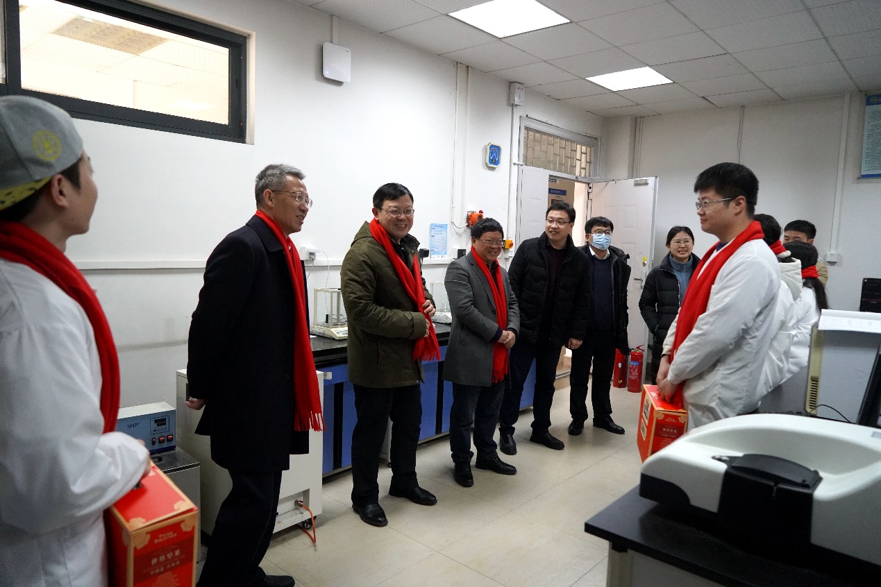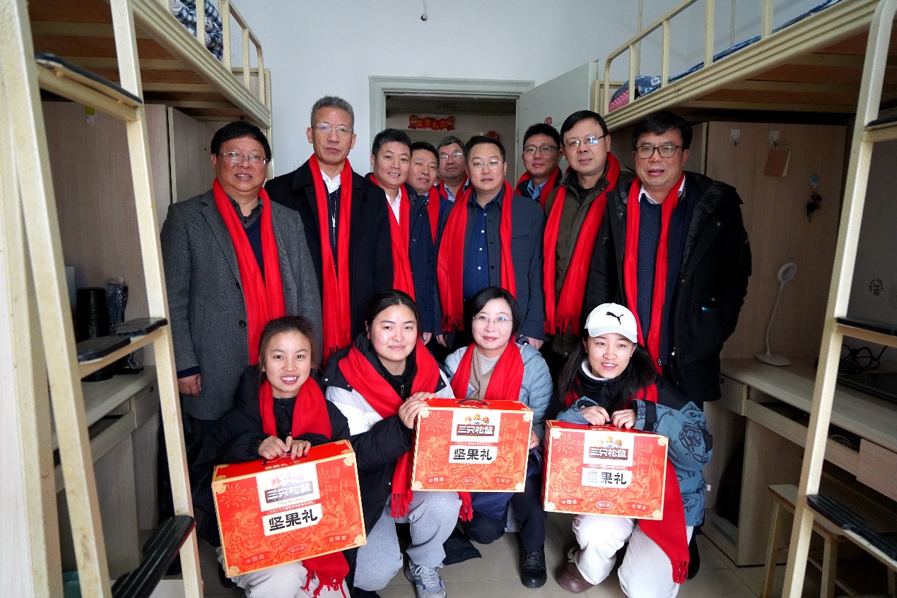 团拜会前,校领导带领相关职能部门负责人前往学生宿舍、实验室走访慰问了寒假留校学生,为同学们戴上喜庆的红围巾,送上新年礼物。每到一处,校领导都亲切询问留校学生留校原因,学习和生活有无困难,并叮嘱同学们要注意劳逸结合,不要违规使用电器,多与家人联系,祝愿同学们新年快乐。