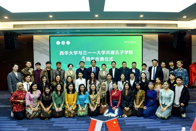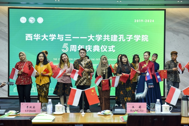 3月8日下午,三一一大学孔子学院五周年庆典仪式在西华大学办公楼和印尼梭罗琐丽雅酒店举行。西华大学校长李秋实、副校长费凌、三一一大学校长贾丽娜、副校长余努思、副校长伊万、中共蓬溪县委副书记王莉、四川锂源新材料有限公司总经理杨志宽、印尼锂源新能源公司总经理办公室主任夏曙光,孔子学院中外方院长、理事及师生企业代表等近百余人出席此次盛典。