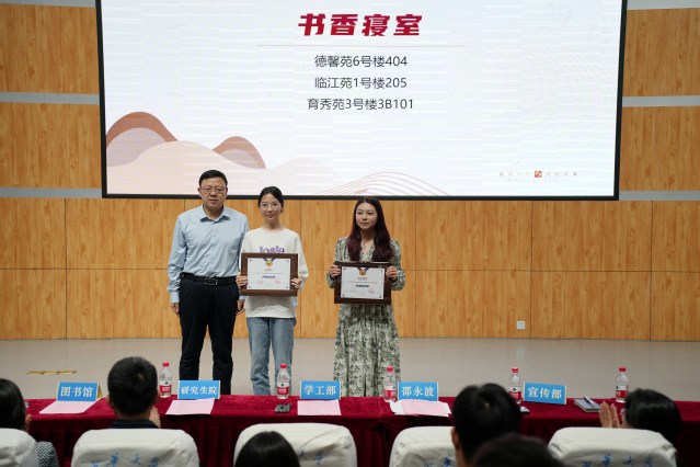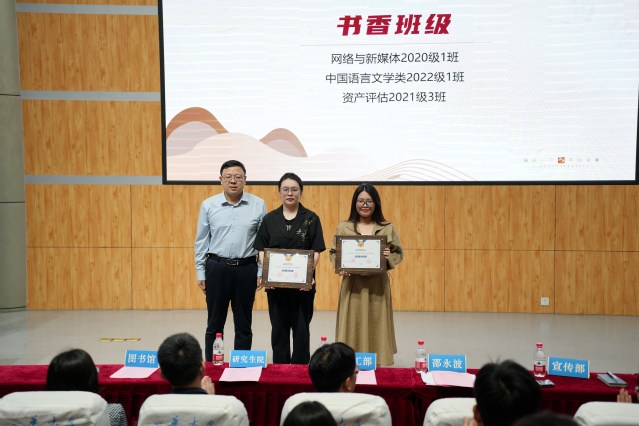 图书馆馆长彭国莉宣读了《关于表彰2024年度优秀读者的决定》。《决定》授予梁志凯等13位同学“进馆之星”荣誉称号,授予周扬君等13位同学“阅读之星”荣誉称号,授予陈紫莹等13位同学“服务之星”荣誉称号,授予德馨苑6号楼404等3个宿舍“书香寝室”称号,授予文学与新闻传播学院网络与新媒体2020级1班等3个班级“书香班级”荣誉称号。老师们现场为获奖同学和集体颁发荣誉证书及奖品。