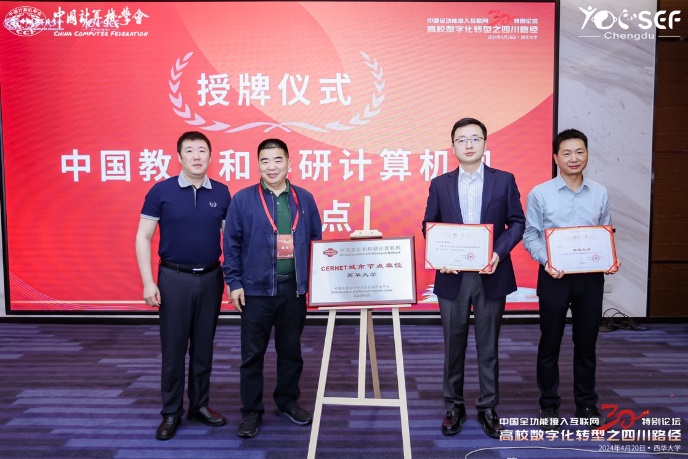 会议期间还举行了中国教育和科研计算机网(CERNET)城市节点授牌仪式,标志着西华大学(宜宾)城市节点正式开通。中国教育和科研计算机网西南地区中心主任、电子科技大学信息中心主任任立勇教授和赛尔网络有限公司四川分公司总经理刘灿共同为节点揭牌,任立勇主任围绕此次会议主题中国全功能接入互联网30周年发表讲话,他回顾了CERNET的发展历史及其之于中国互联网的历史意义,并表示西华大学城市节点的建设,对推动信息化建设、资源共享及区域性教育信息化平台建设具有重要意义,将为数字化转型发展注入新动力。