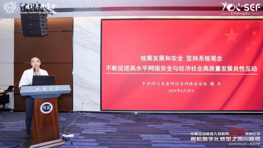 专家报告环节,四川省委网信办网络安全处处长魏杰作了题为《统筹发展和安全 坚持系统观念——不断促进高水平网络安全与经济社会高质量发展良性互动》的主题报告,强调网络安全在教育数字化转型中的重要性,指出高校作为人才培养的摇篮,必须高度重视网络安全建设,确保数字教育在安全可控的环境下发展。