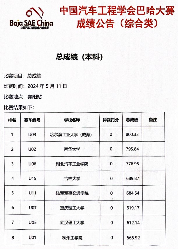 5月7日-11日,2024中国大学生方程式系列赛事巴哈大赛(襄阳站)在襄阳举行。来自吉林大学、武汉理工大学、哈尔滨工业大学等高校的58支车队参加了此次比赛。我校鲨车队U2参加了本科组比赛,总成绩第2名,操控性第1名,牵引第1名,单圈计时第2名,4小时耐久赛第4名,获得了巴哈大赛年度亚军。虎鲨车队U2是本科组唯一一支通过专项赛的车队,获得了总成绩一等奖。何灼馀、孙树磊老师获得杰出指导老师奖,全体参赛队员获得中国汽车工程学会颁发的见习工程师证。本次比赛充分体现出西华学子的吃苦耐劳、勇于进取的精神及赛车水平,为学校赢得了荣誉。