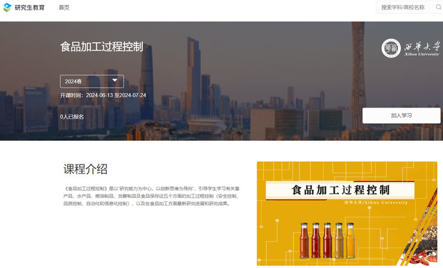近日,我校食品与生物工程学院马嫄教授团队的《食品加工过程控制》研究生课程在国家高等教育智慧教育平台“研究生教育”在线开放课程板块上线,面向全社会开放共享,学校研究生课程建设取得突破性进展。