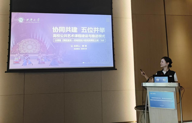 在6月13日下午全国第七届大学生艺术展演活动高校美育改革创新优秀案例报告会上,曾焯老师向来自全国高校的美育同行做了题为《协同共建 五位并举 高校公共艺术课程建设与推进模式——以课程《舞蹈鉴赏—领略西部少数民族舞蹈之美》为例》的案例分享,从美育课程建设与成效两个方面介绍了西华大学舞蹈类美育课程通过“美育+德育”的育人途径形成了1强化、2并行、3结合、4提升、5培养的“五位并举”教学创新方式,让大学生真正成为课程的参与者、受益者、传播者、反哺者,取得了丰硕的育人成果,切实坚定了文化自信,增强了文化自觉。