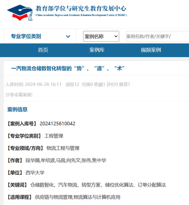 自2023年7月案例征集和评选工作开始以来,管理学院积极组织专业教师进行案例撰写。段华薇教授主持撰写的教学案例——《一汽物流仓储数智化转型的“势”“道”“术”》,先后经过多次案例企业实地调研、撰写、初审、修改、再审等努力,不断对案例内容进行完善,对案例编写进行有效规范,最终成功入选中国专业学位教学案例库。未来,管理学院将进一步推进专业学位研究生教学案例编写和案例库建设工作,继续深化专业学位研究生培养模式改革,有效推动专业学位研究生培养质量不断提高。