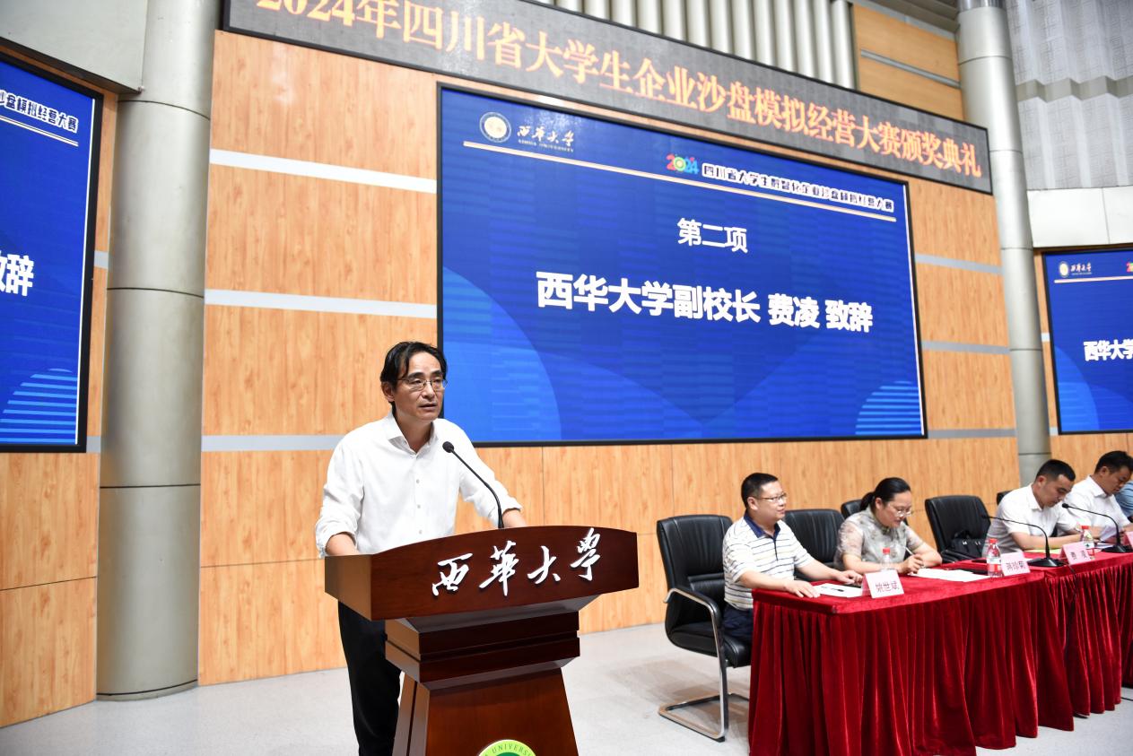 颁奖典礼上,副校长费凌讲话。费凌指出,本赛事已连续举办11年,西华大学也连续承办了11年。当前,数智化人才培养是当今世界各国竞相发展的战略需求,我国现代化建设要求加强数字化、智能化、信息化等方面的能力建设,以适应日益激烈的国际竞争和全球化发展的需要。本次大赛正是提升数智化经管类人才培养的重要举措,希望各位获奖选手珍惜荣誉,不断提升自己,为四川省社会经济发展贡献更多的智慧和力量。