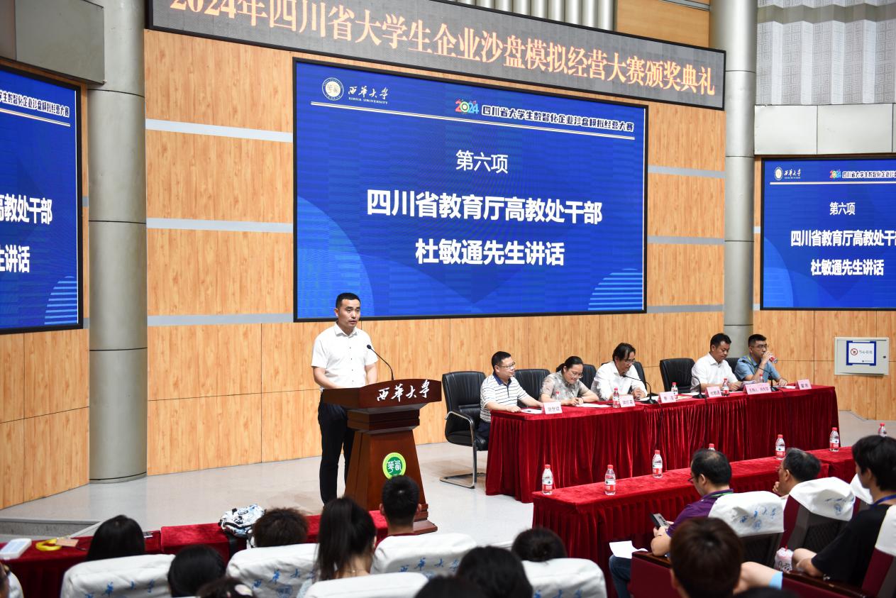 大赛颁奖典礼于下午6时在四教报告厅举行。四川省教育厅高教处干部杜敏通,西华大学副校长费凌,教务处处长蒋珍菊,管理学院党委书记肖东华、副院长姚世斌,新道科技股份有限公司西南区副总经理瞿刚以及来自省内各高校的参赛学生、指导老师参加了颁奖典礼。颁奖典礼由肖东华。