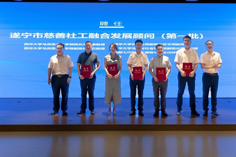 马克思主义学院院长冯永泰教授,研究生院副院长苏文明教授,马克思主义学院副院长王贝教授,法学与社会学学院副院长熊征教授受聘遂宁市慈善社工融合发展顾问。