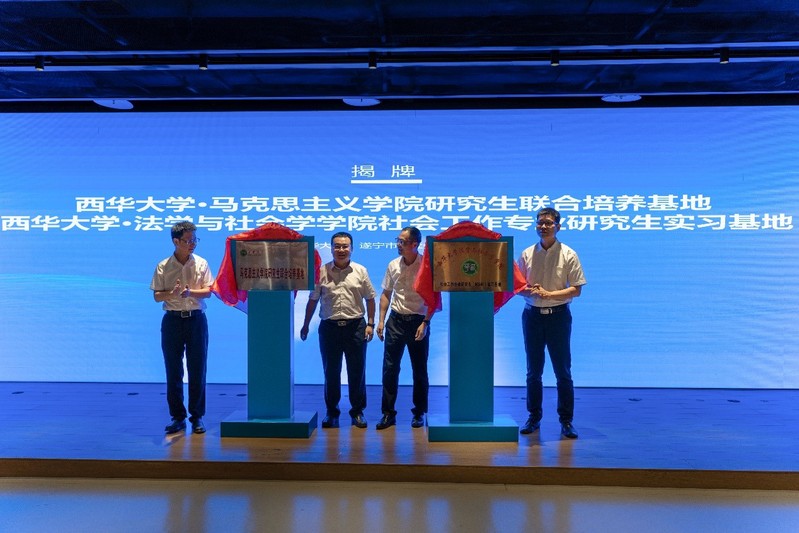 双方领导共同为西华大学马克思主义学院研究生联合培养基地、法学与社会学学院社会工作专业研究生实训基地揭牌。