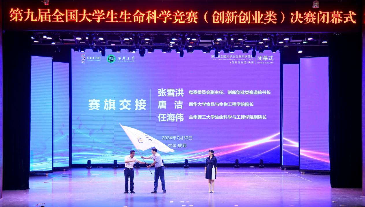 闭幕式上还举行了赛旗交接仪式。全国大学生生命科学竞赛委员会副主任委员、上海交通大学张雪洪教授、西华大学食品与生物工程学院院长唐洁教授、兰州理工大学生命科学与工程学院副院长任海伟教授现场交接了赛旗。赛旗成功交接后,任海伟代表获得第十届全国大学生生命科学竞赛(创新创业类)决赛承办权的兰州理工大学讲话,他介绍了学校、学院的基本情况以及人才培养成效,并对能够承办下一届竞赛感到荣幸,充满期待。