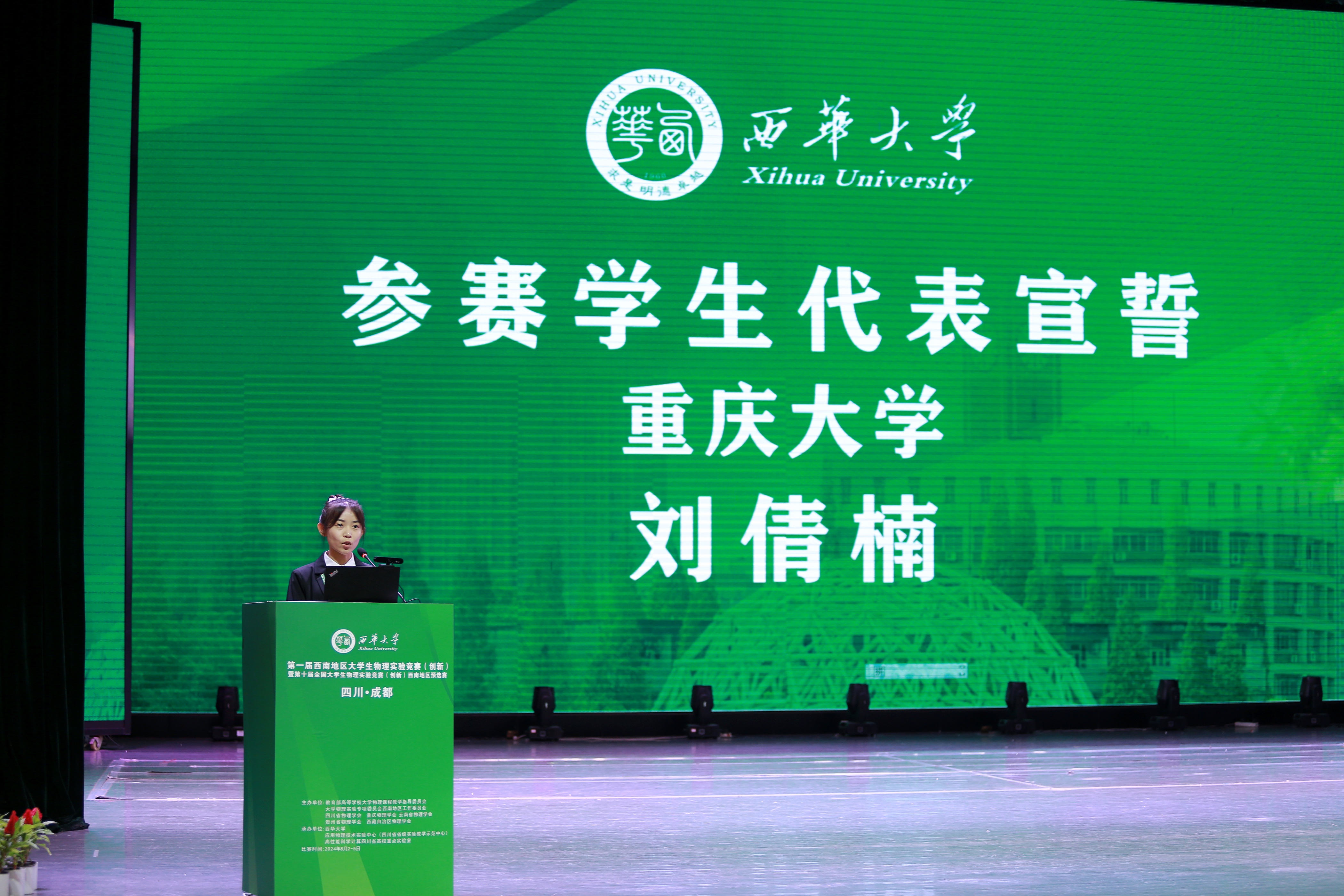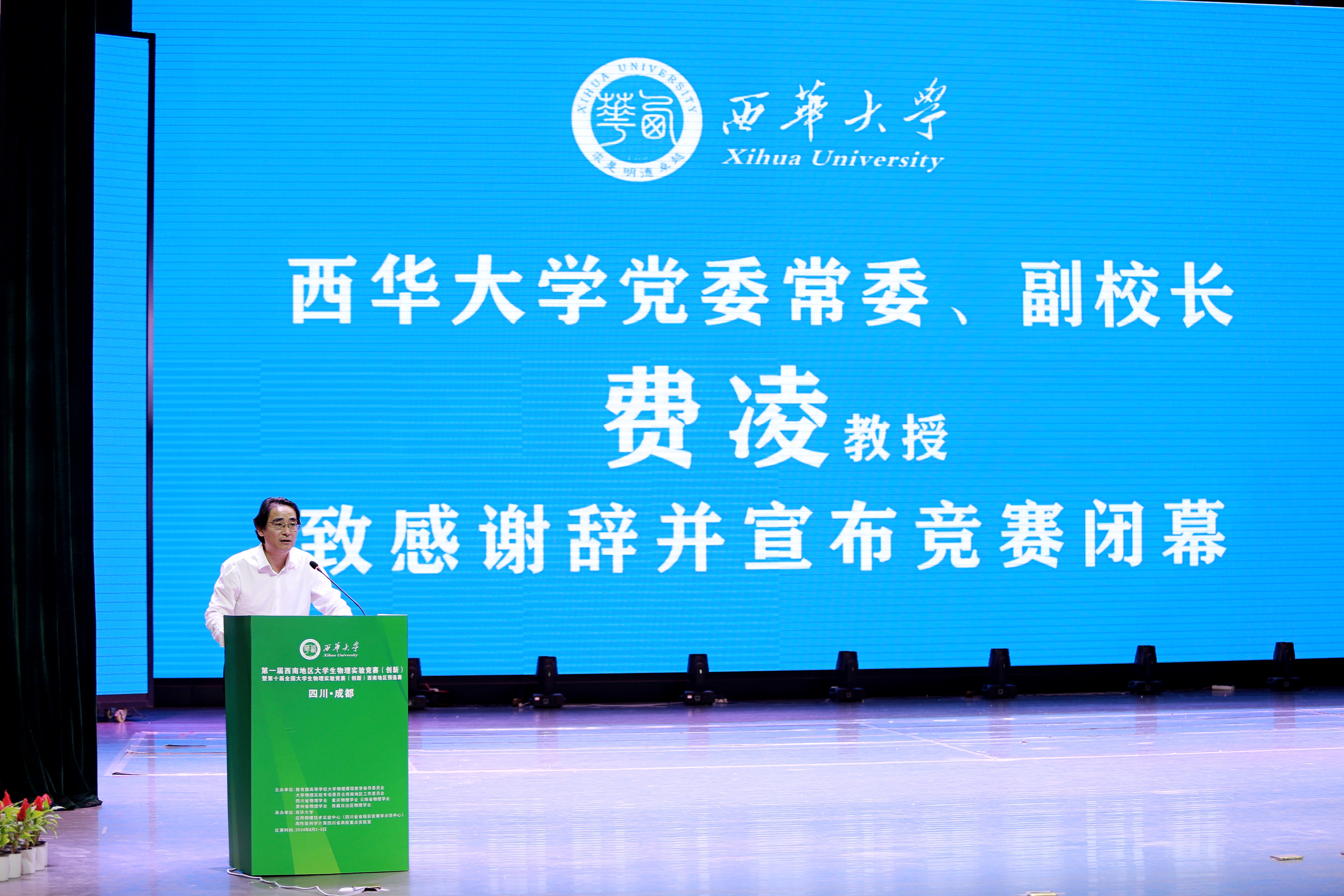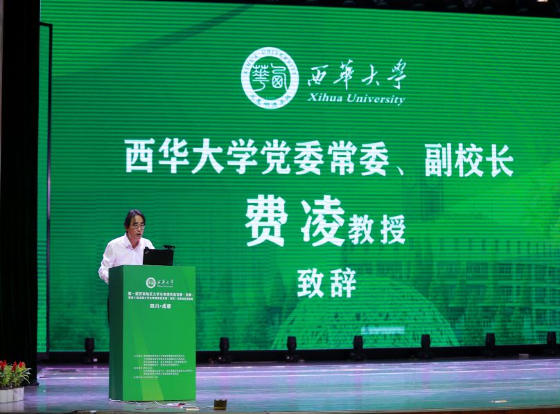 西华大学党委常委、副校长费凌代表学校致辞。他强调物理学科在推动科技进步和社会发展中的重要作用,鼓励参赛师生勇于探索、敢于创新,为西南地区的物理学科发展贡献青春力量。