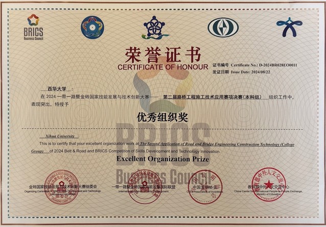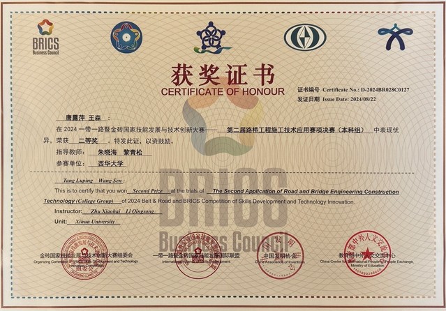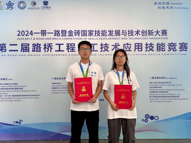 8月20日-22日,2024“一带一路”暨金砖国家技能发展与技术创新大赛——第二届路桥工程施工技术应用赛项决赛(本科组)在山东交通职业学院举行。我校汽车与交通学院交通工程专业学生唐露萍、王森(指导教师:朱晓海、黎青松)荣获全国二等奖,西华大学荣获“优秀组织奖”。