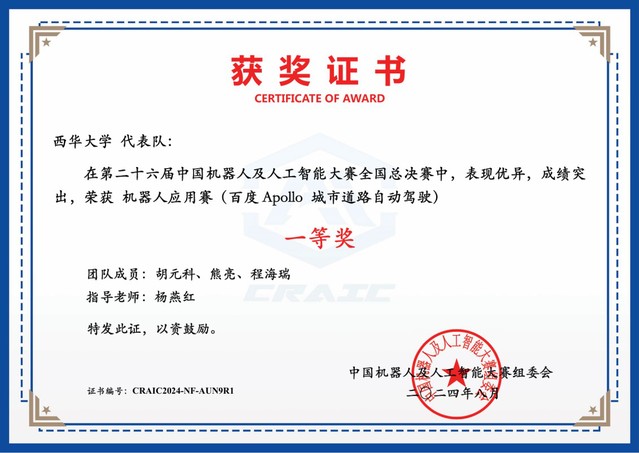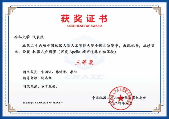 8月25日,第二十六届中国机器人及人工智能大赛全国总决赛落下帷幕。我校汽车与交通学院新能源汽车工程专业2021级学生胡元科、熊亮和汽车服务工程专业2021级学生程海瑞在杨燕红老师的带领下,凭借卓越的技术实力和顽强的意志,以总决赛第三名的成绩勇夺“百度 Apollo 城市道路自动驾驶”赛道的全国一等奖。新能源汽车工程专业2021级学生宋润涵、林锦涛和廖阳组成的团队,也成功进入国赛并荣获全国三等奖。