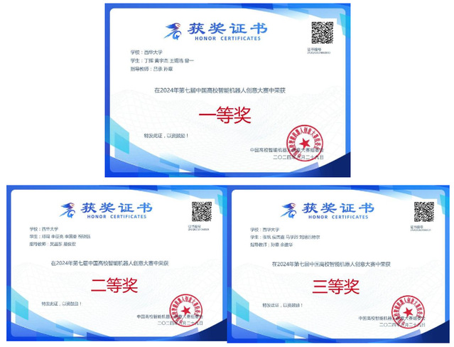 8月22日上午,第七届中国高校智能机器人创意大赛全国决赛正式拉开帷幕。来自全国27个省(自治区、直辖市)共382所高校的1366支参赛队伍、4192名参赛选手齐聚一堂,展开了激烈的比拼。我校丁辉、邓闯、张帆等同学所在的3支代表队,以饱满的热情、最佳的竞技状态,在赛场上沉着冷静、奋力拼搏,展现了卓越的技术实力和强烈的团队精神。经过激烈角逐,我校代表队分别荣获全国一、二、三等奖,这一成绩不仅是对团队技术能力的充分肯定,也彰显了学校在机器人领域人才培养方面的卓越成效。