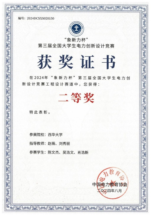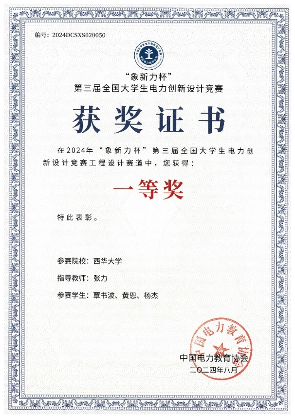 近日,由中国电力教育协会主办的“象新力杯”第三届全国大学生电力创新设计竞赛决赛在上海电力大学举行。经初赛选拔,大赛开放创新赛道、工程设计赛道共有289件作品进入决赛进行比拼。在决赛中,由我校能源与动力工程学院、电气与电子信息学院联合组建的研究生团队(覃书波、黄恩、杨杰)荣获全国一等奖,电气与电子信息学院本科生团队(陈文杰、吴浩文、肖浩新)荣获全国二等奖,张力副教授被授予“优秀指导教师”称号。