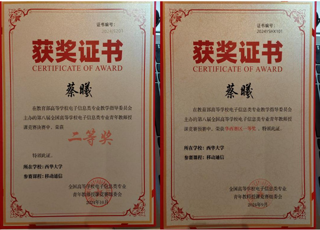 蔡曦老师是我校电气与电子信息学院的一名优秀青年教师,工学博士,担任本科生《无线通信原理与移动网络》《数字信号处理B》《工程管理与经济决策》以及研究生《现代数字通信》等课程的教学工作。她曾获西华大学第八届青年教师讲课比赛二等奖,主持并参与校级教改项目多项,参与录制“新华思政”案例课程(数字信号处理),公开发表论文和专利十余篇,指导学生获得国家/省级学科竞赛多项荣誉,并通过ISW教学技能水平认证。