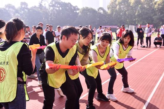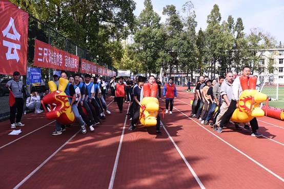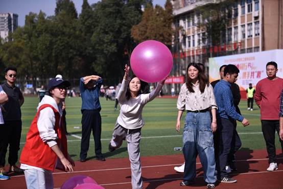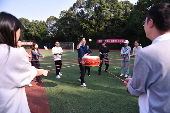 本次趣味运动会延续了金龙钻圈、流水乒乓、桌上保龄球、陆地龙舟、趣味投篮、欢乐飞盘、鼓动人心等老师们喜闻乐见的趣味项目,并在正式比赛前组织了一场活力四射的热身操,每一个比赛项目都趣味十足、充满智慧的较量和飞扬的激情。在郫都校区,体育学院健美操专业教师易刚带领近千名教职工,在动感十足的音乐声和充满激情的口令声中跳起热身操。短短十分钟,让老师们在运动中体验到松弛,在汗水中释放了压力。