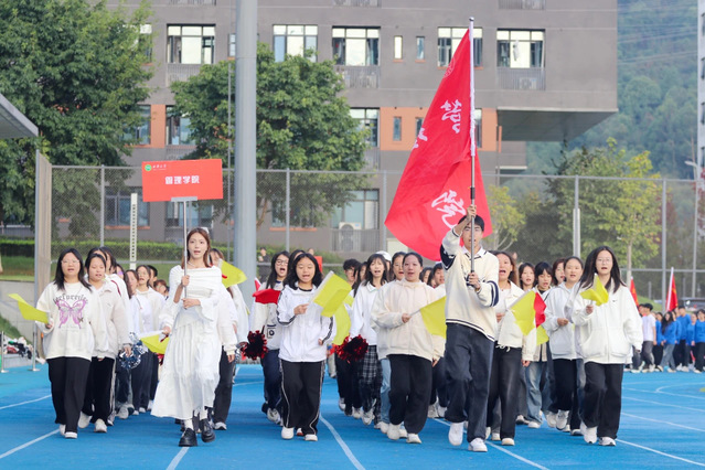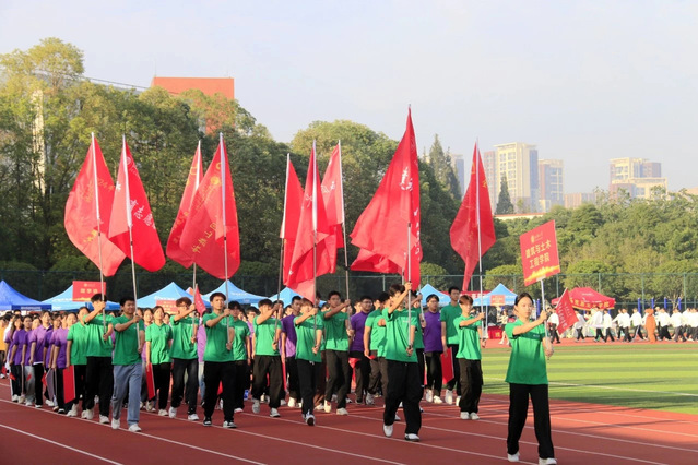 伴随着《运动员进行曲》的高昂旋律,各方队带着饱满的精神、蓬勃的朝气,迈着整齐划一的步伐走向主席台。眼神坚定,满是青春能量;口号嘹亮,尽展西华风貌。