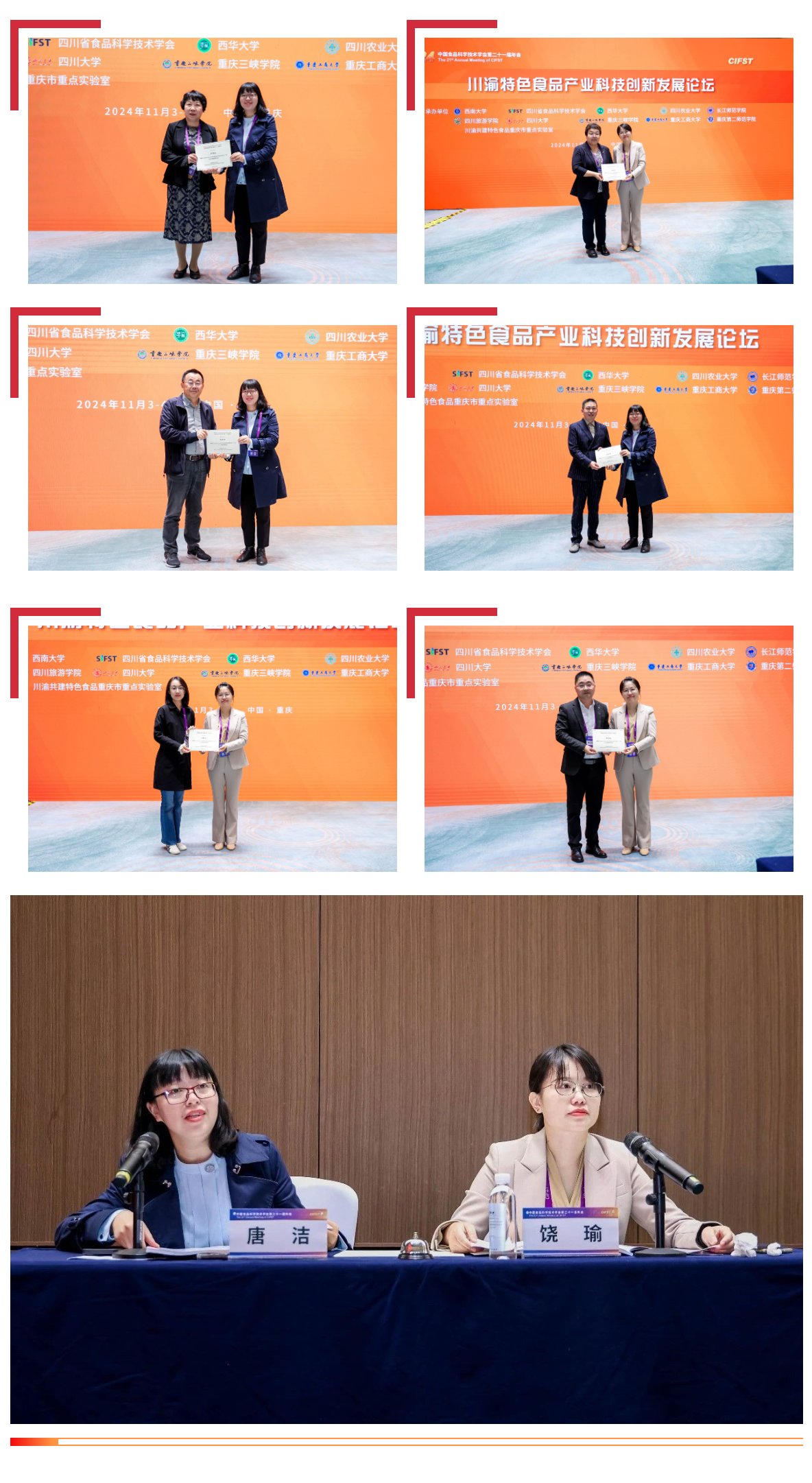 11月3日—4日,由西南大学、四川省食品科学技术学会、西华大学等10家单位共同承办的中国食品科学技术学会第二十一届年会在重庆顺利召开。中国食品科学技术学会名誉理事长孟素荷,孙宝国、谢剑平、朱蓓薇、陈坚、钱锋、任发政、李培武、单杨、谢明勇、金征宇、薛长湖等11位中国工程院院士,及有关专家出席大会。来自食品科技界和产业界的专家学者及企业代表2000余人参会。我校食品与生物工程学院陈祥贵教授、院长唐洁教授、副院长饶瑜教授、副院长林洪斌副教授、吴韬教授、马嫄教授、杨潇教授、徐敏副教授、张东副教授等20余人参加本次会议。