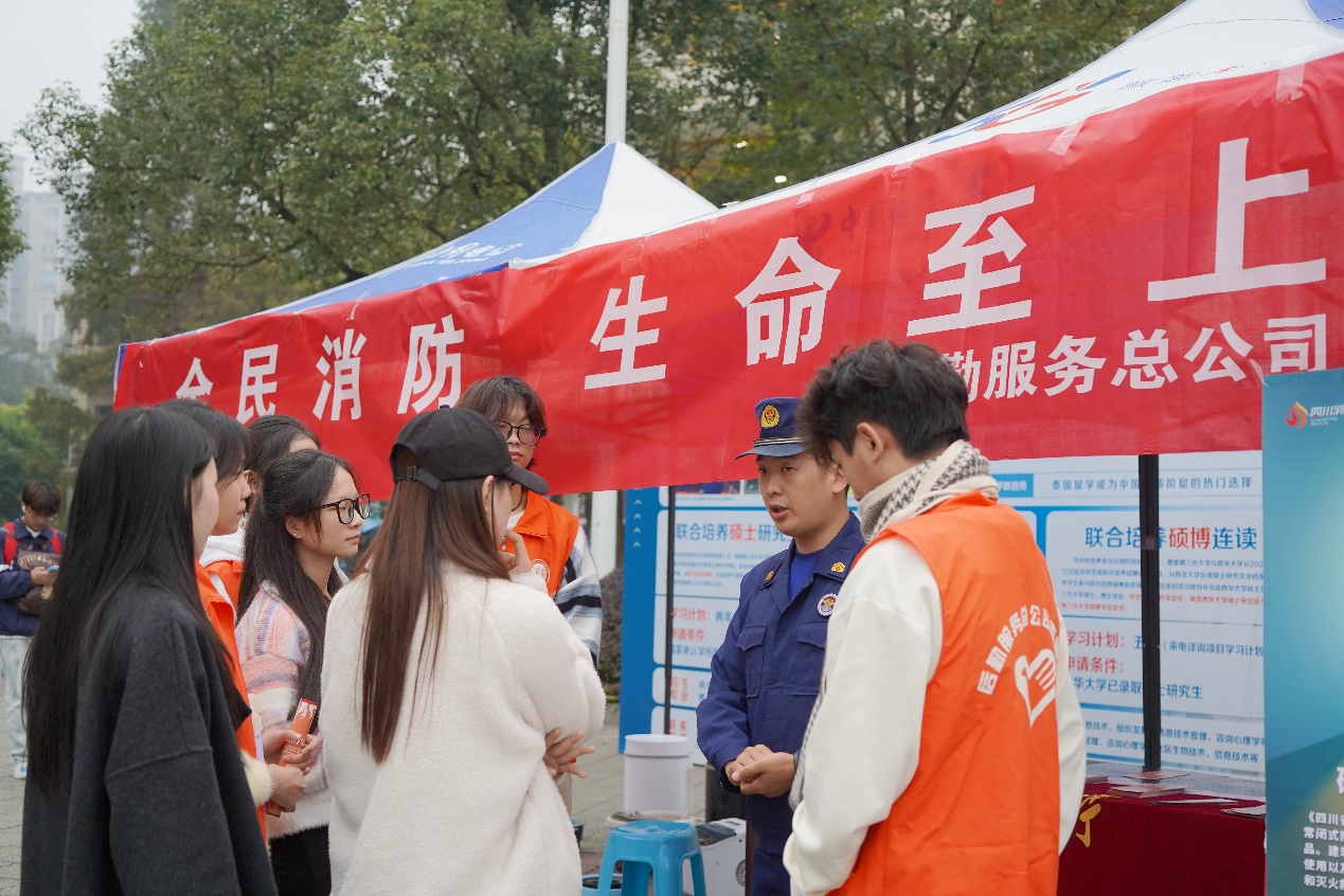 此外,学校还在明德广场举行了消防安全宣传展,内容包含消防安全日由来、火灾危害性及防范措施、灭火器及消防栓的使用步骤等,吸引了众多师生观看。来自校团委、后勤服务总公司、建筑与土木工程学院、食品与生物工程学院的青年志愿者通过消防知识有奖问答、消防器具拼图、分发消防安全提示卡、消防小游戏等互动,吸引同学们参加消防宣传活动,在轻松的氛围中增强消防安全意识。