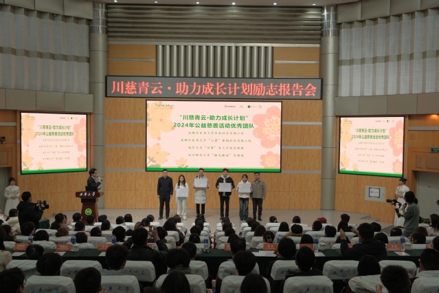 报告会现场,与会领导和嘉宾为优秀的受助学生颁发“川慈青云·助力成长计划”奋进奖学金,并向2024年公益慈善活动优秀团队颁发了荣誉证书。