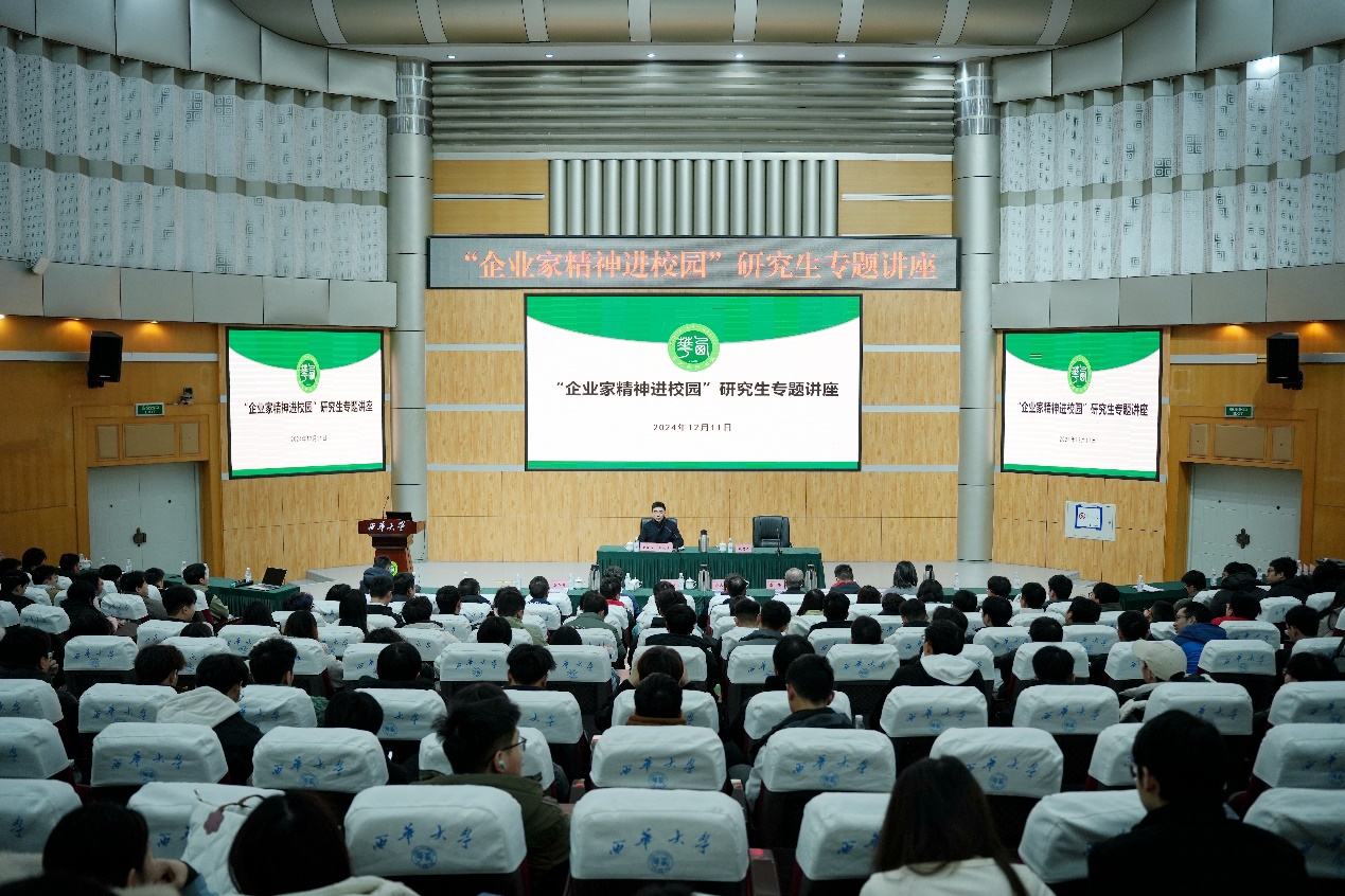 在随后举行的“企业家精神进校园”研究生专题讲座上,高文宝总裁、龚大兴董事长分别以“如何追求卓越”和“因被刺激,所以创业”为题,分享作为企业家如何在新时代推进强国建设、民族复兴伟业中挺膺担当、贡献力量的感悟和体会。相关职能部门及学院负责人、各学院教师及研究生代表共计300余人参会。报告会由李秋实校长主持。