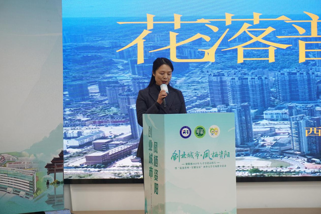 资阳市委组织部部务委员王萍作资阳市推介。她用“成渝之心”“蜀人原乡”“产业新城”三个关键词,生动勾勒出资阳独特的区位优势、深厚的历史底蕴和蓬勃的产业发展态势,并详细介绍了资阳市迭代升级的人才政策体系,向在场学子发出了“选择资阳、奔赴资阳、扎根资阳”的盛情邀约。