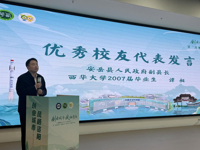 安岳县人民政府副县长、我校2007届校友谭昶深情回顾了在校求学的青葱岁月和扎根基层的成长历程,并以“敢想才有可能”“试过才知道答案”“持续保持对专业的热爱”三句话分享了成长感悟,鼓励学弟学妹选择成长型平台,实现个人与区域共同发展。