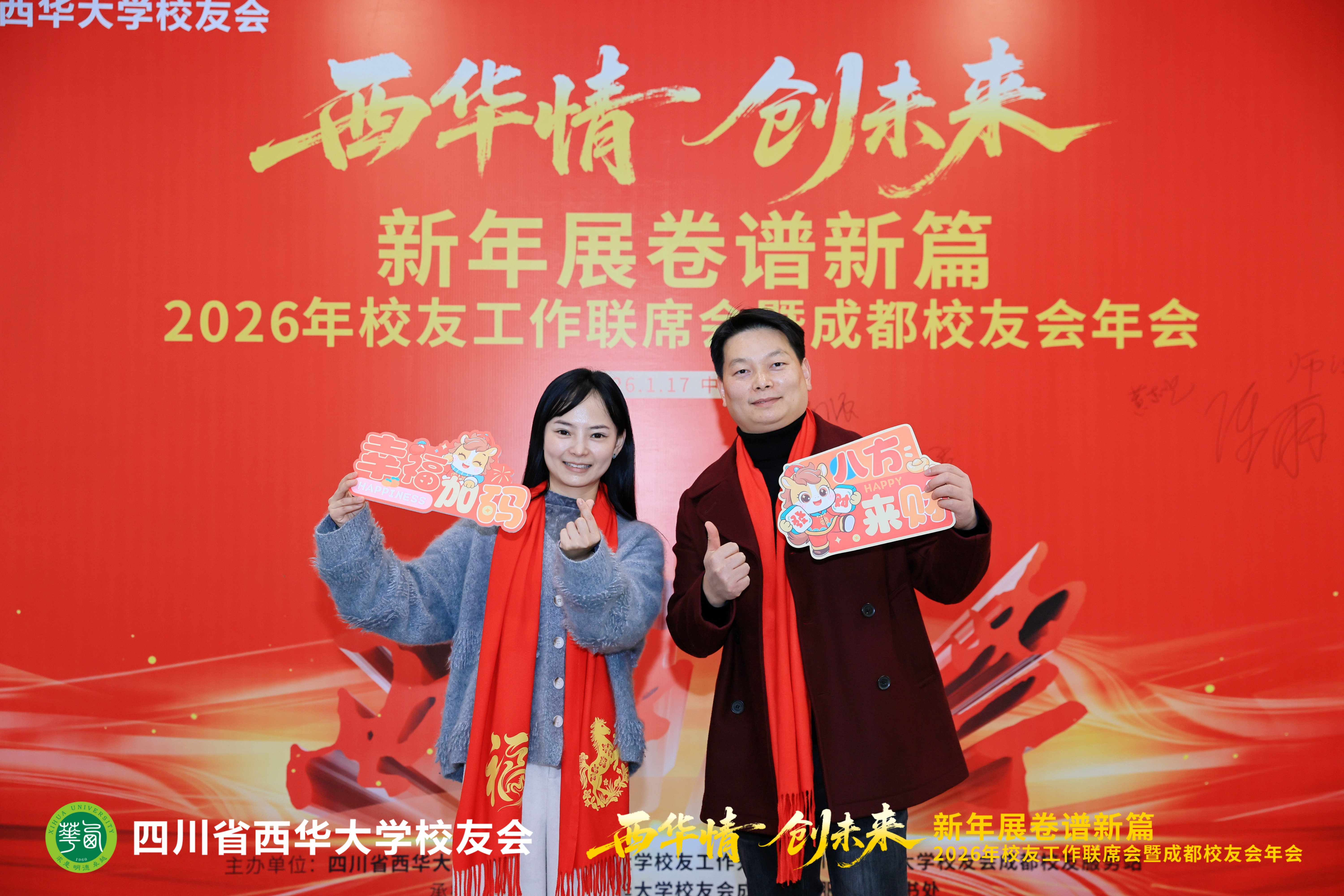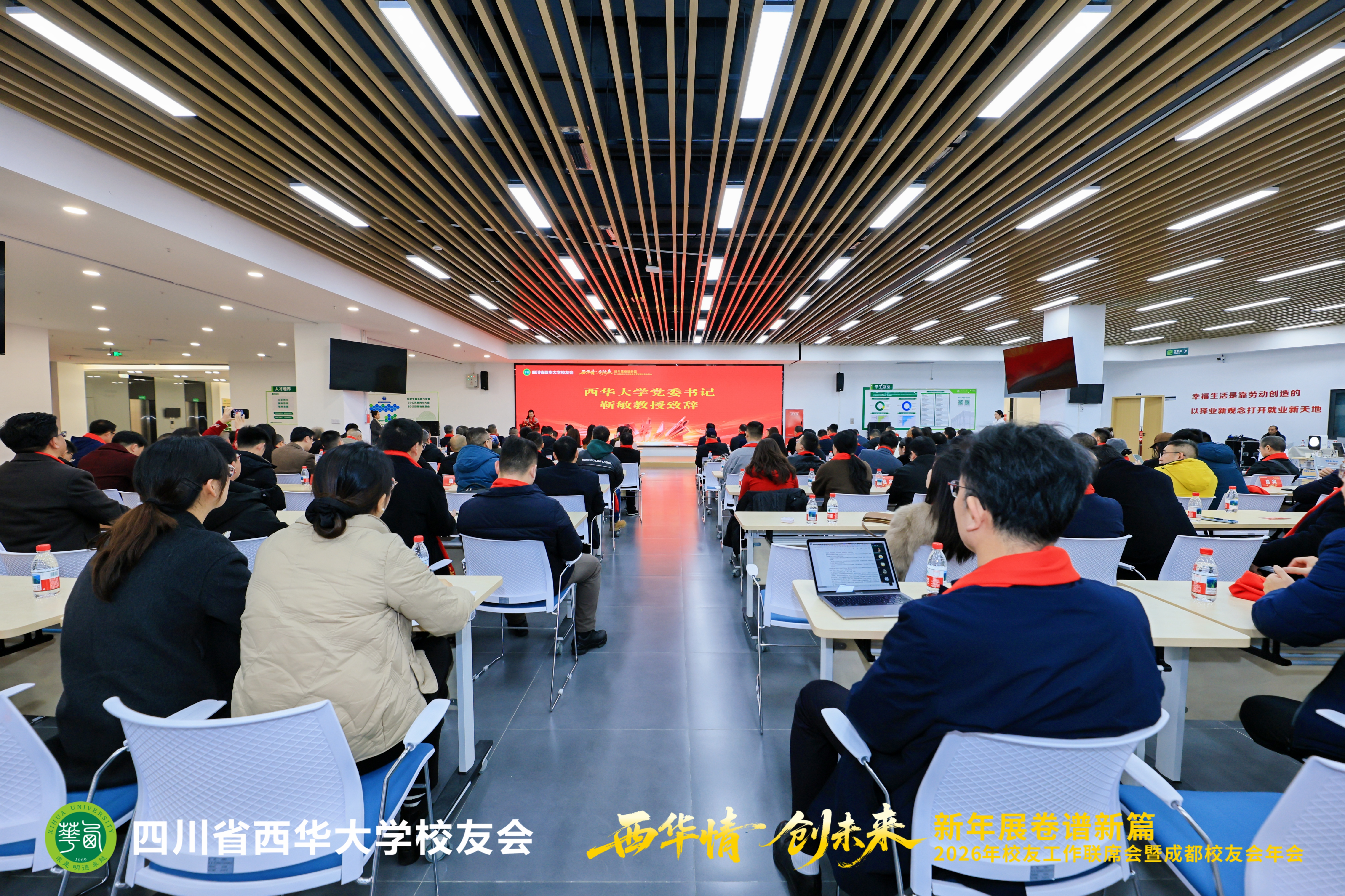 1月17日,2026年校友工作联席会暨成都校友会年会在郫都校区召开。会议以“西华情·创未来——新年展卷谱新篇”为主题,党委书记靳敏,党委副书记郎方年,校内各单位负责人与来自各地的校友代表、嘉宾欢聚一堂,共叙情谊、共商发展。