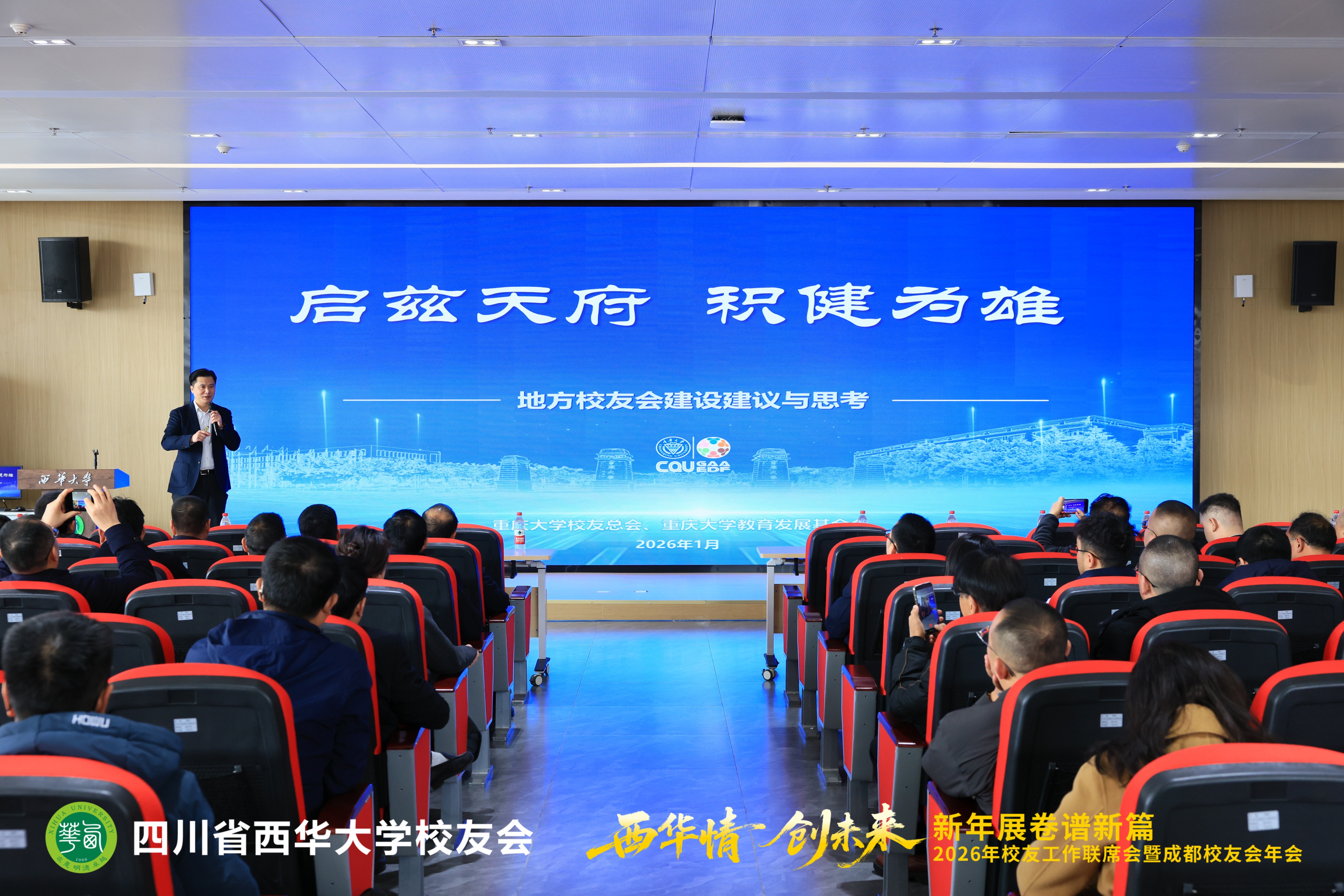 会前,重庆大学校友总会秘书长许骏教授应邀作题为《启兹天府 积健为雄——地方校友会建设建议与思考》的专题报告。许教授结合重庆大学校友工作的先进经验,阐述了校友会作为“情感联结的中心、事业协同的平台、发展赋能的引擎”的战略定位,强调校友组织应着力培育“活力性、互动性、渗透性与传承性”,并介绍了旨在扶持青年校友、推动产业协同的“红叶行动”,为校友工作创新提供了实践参考。